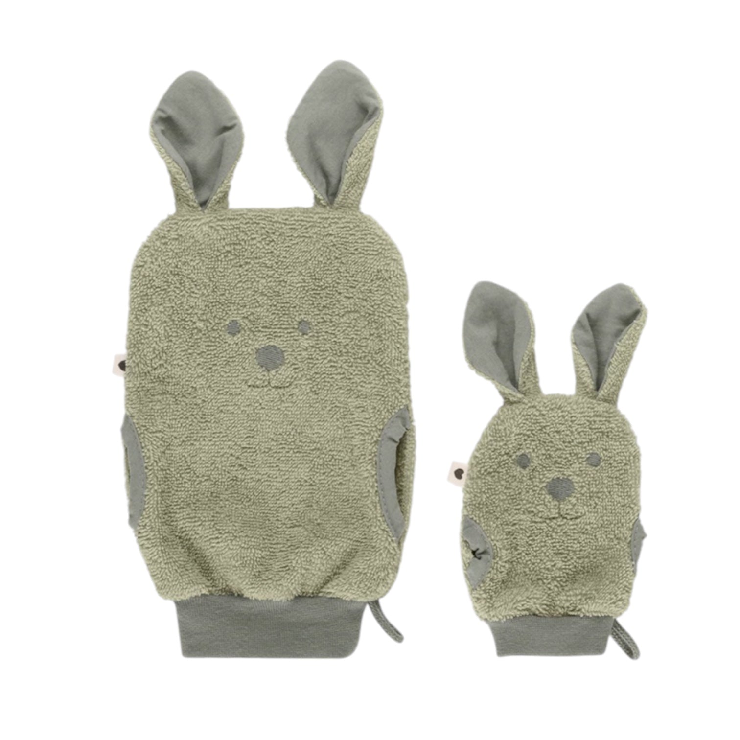 BIBS Bath Mitts consist of one adult size and one child size (1-2 years). The bath mitts will carefully massage your baby‘s skin and create the perfect amount of foam to moisturize and cleanse.