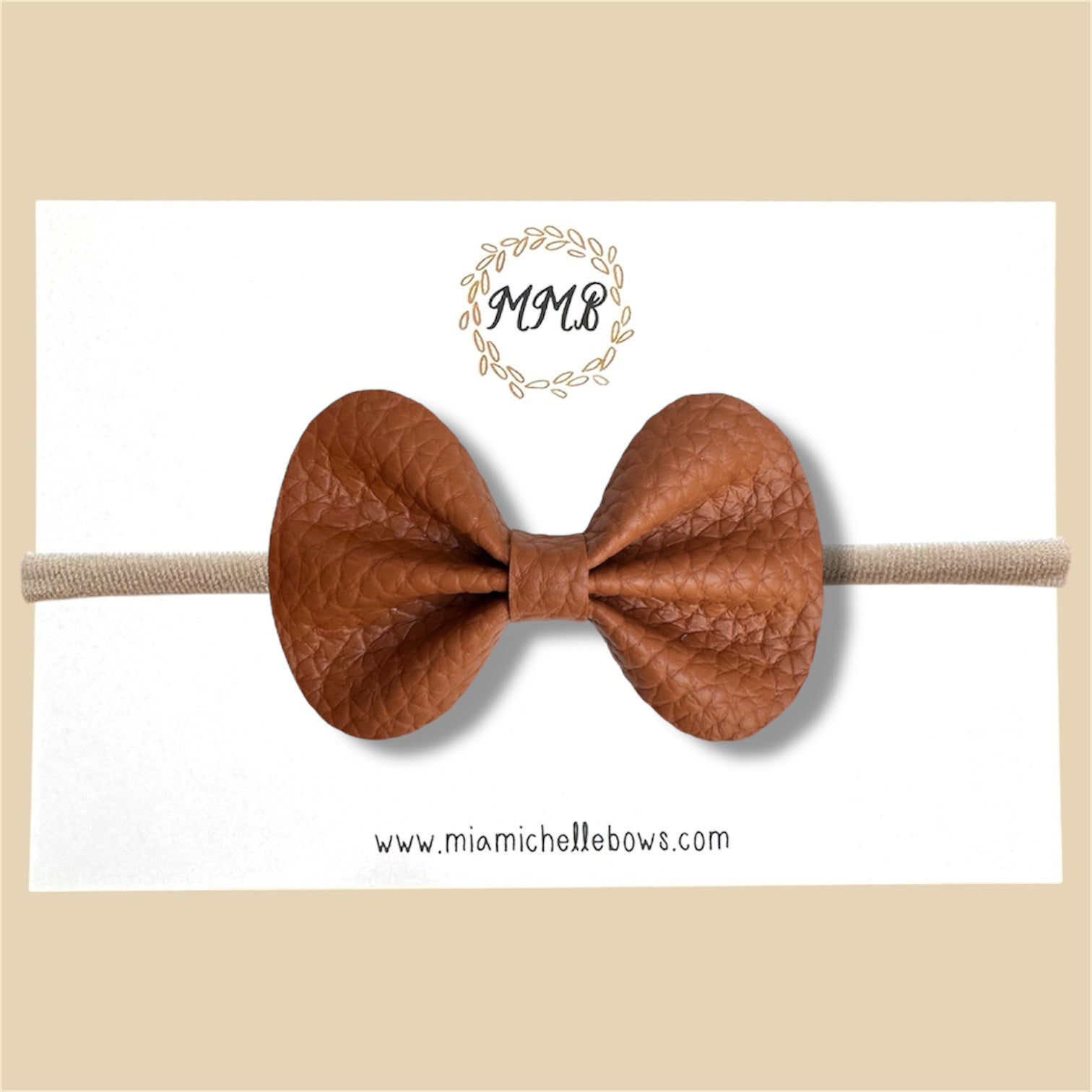 Adorable Bow made from faux leather. Measures approximately 2.75 inches across.  Available as a headband or clip!