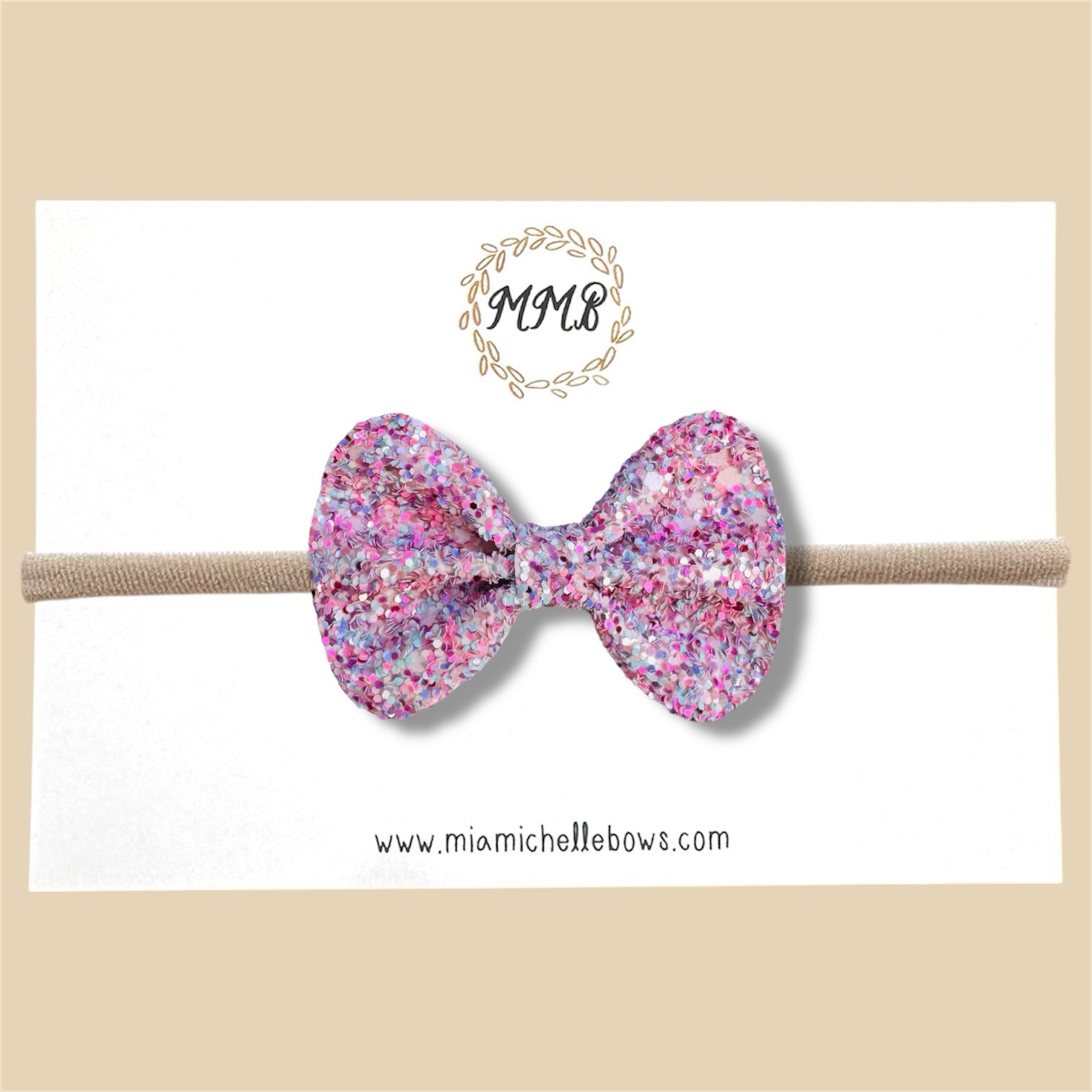 Dazzling Glitter Bow.  Made from shed resistant glitter fabric. Measures approximately 2.75 inches across.  Available as a headband or clip!