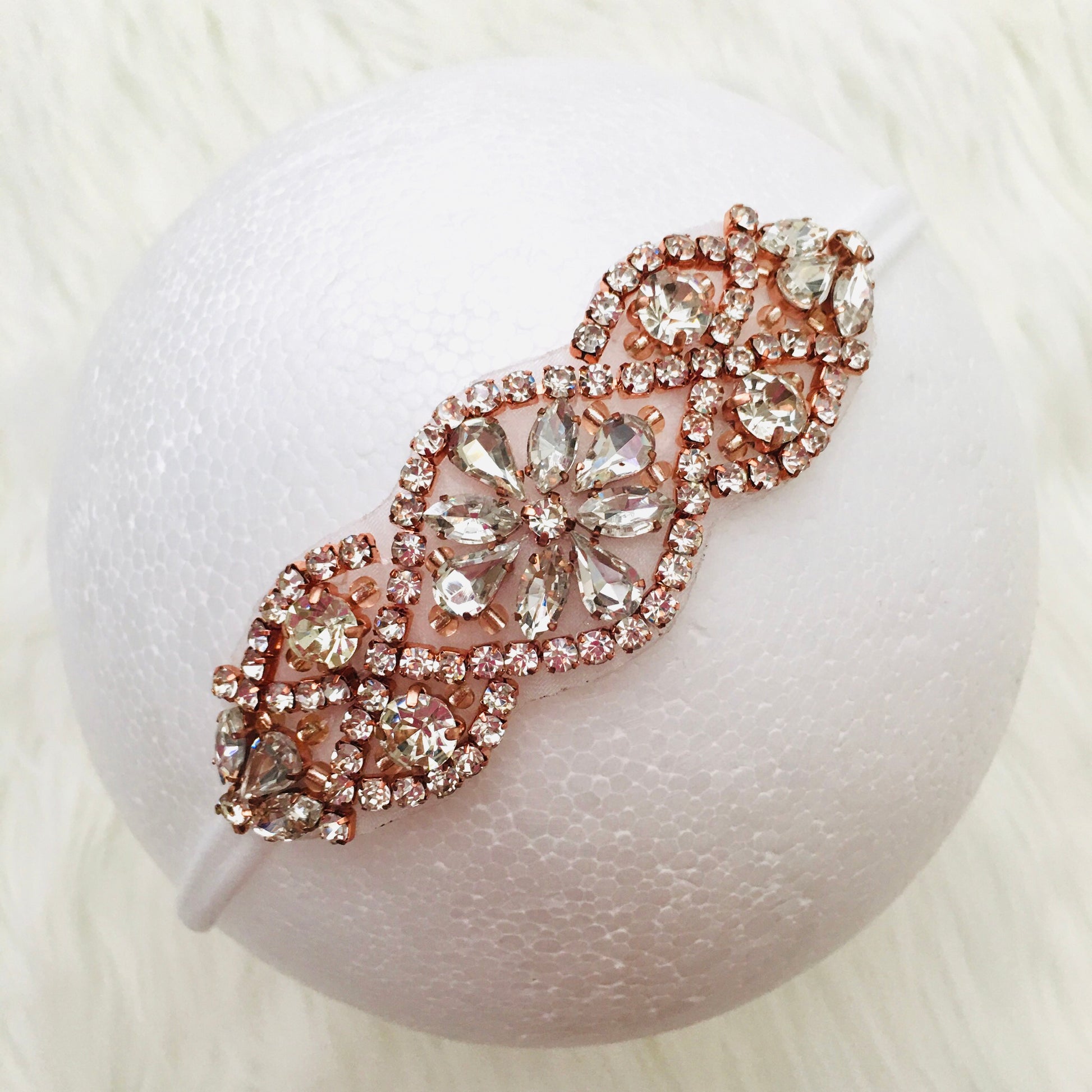 Be ready to turn heads in this stunner! The perfect touch of sparkle for photos or any special event. Hand sewn on a comfortable nylon band that will stretch and fit newborns all the way up to adults. Large jewel detail measures about 3.75 inches.