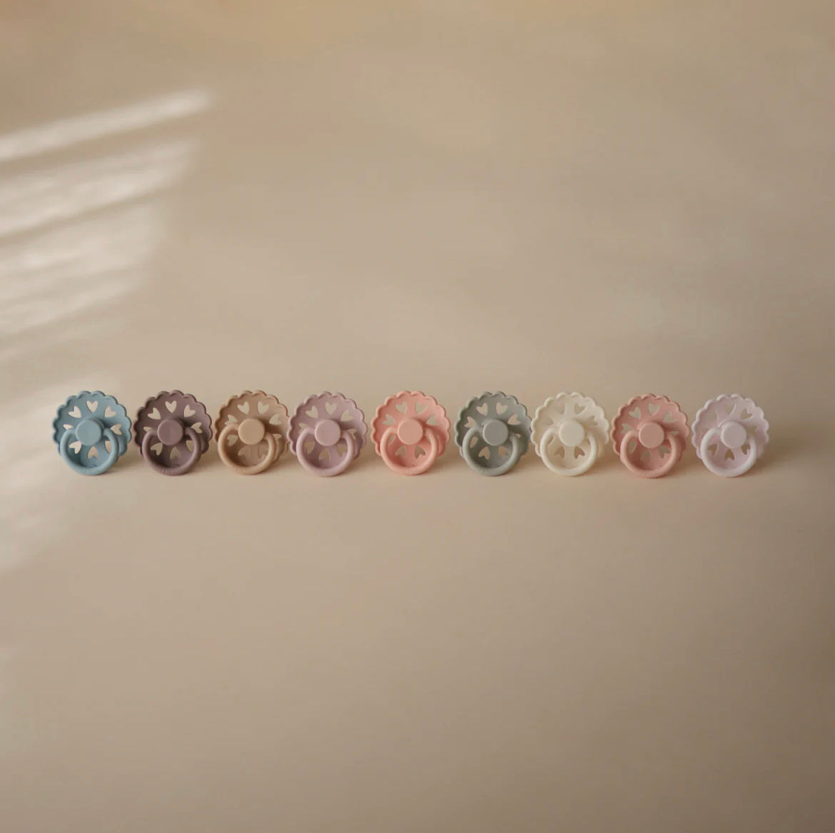 The FRIGG Fairytale rubber pacifiers are thoughtfully designed for your baby's comfort with natural latex and soothing properties. Each pacifier color draws inspiration from a timeless story by Danish author Hans Christian Andersen. The outward curve keeps the pacifier off delicate skin while features like air holes and a security handle ensure your baby's safety. Within the pacifier shield, air holes reveal eight little hearts that recreate Andersen's carved artwork motif and symbolize the universal language of love.