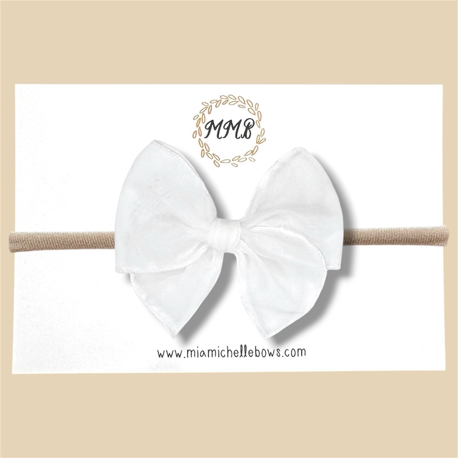 A single darling handmade bow in your choice of size on a soft nylon headband or clip.