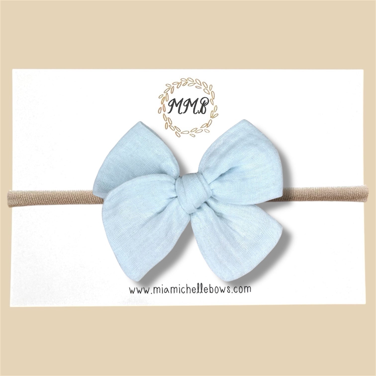 A single darling hand-tied bow in your choice of size on a soft nylon headband or clip.