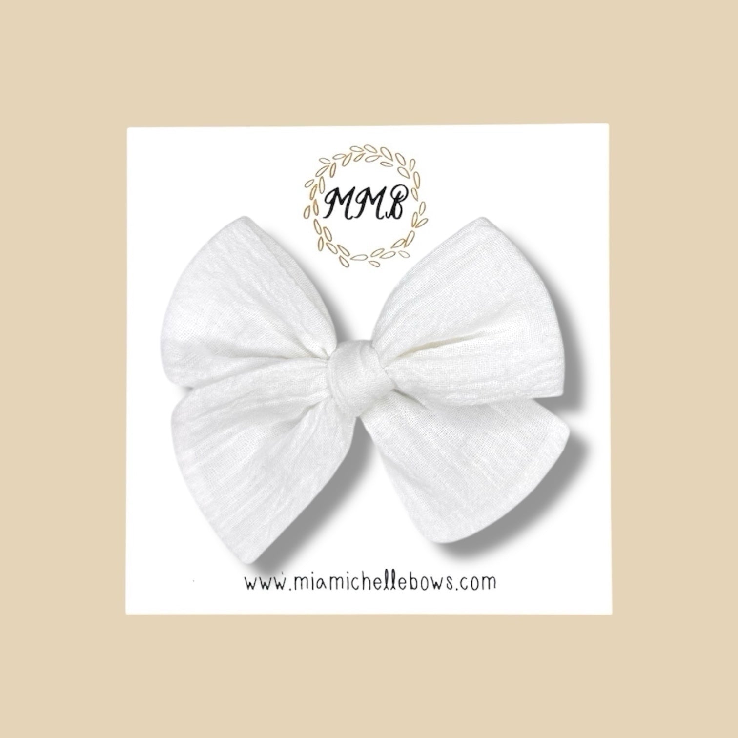 A single darling hand-tied bow in your choice of size on a soft nylon headband or clip.