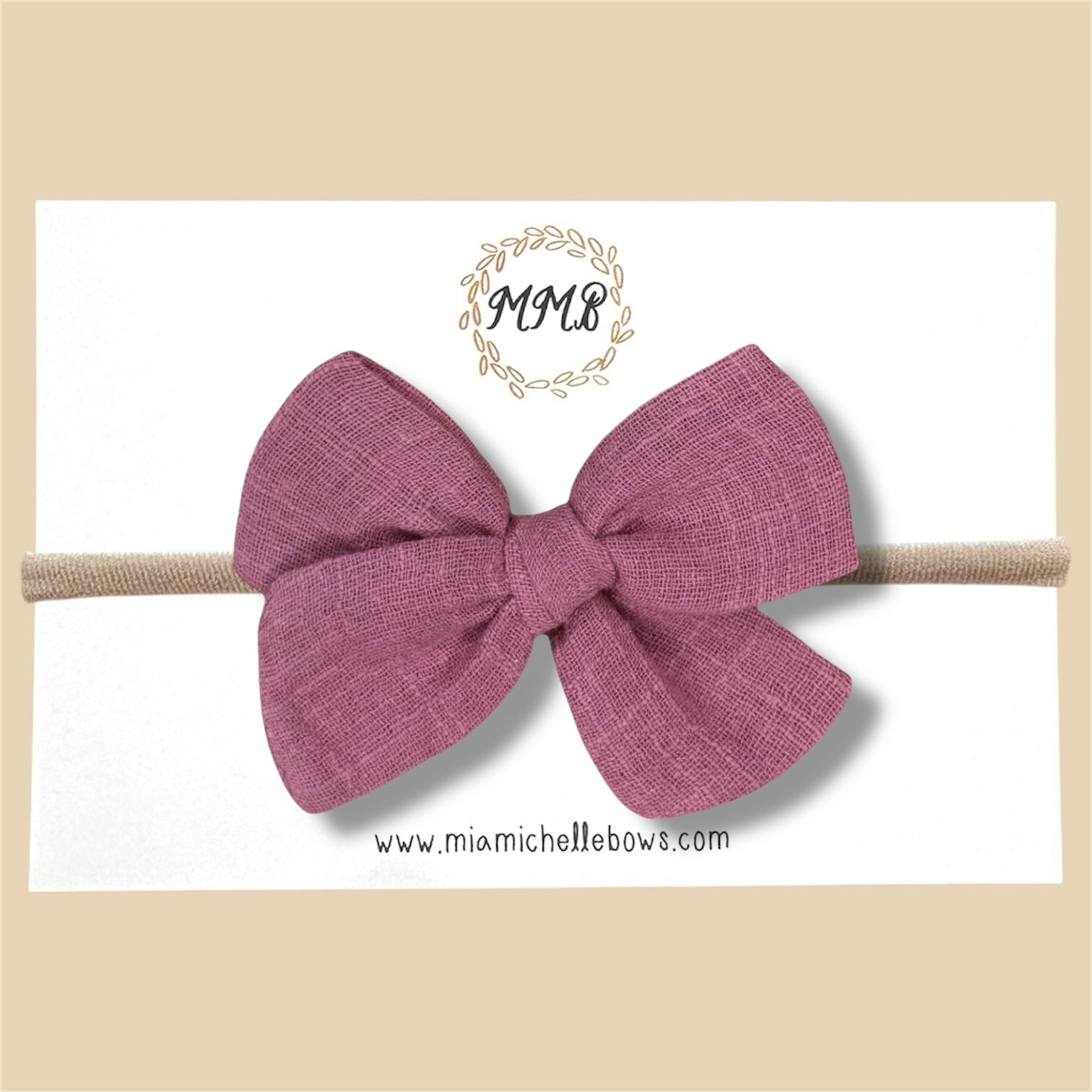 A single darling hand-tied bow in your choice of size on a soft nylon headband or clip.