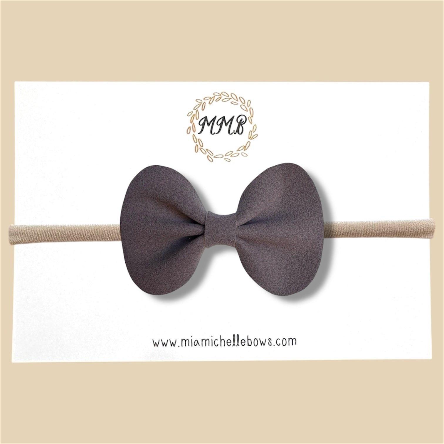 Adorable Bow made from faux leather. Measures approximately 2.75 inches across.  Available as a headband or clip!