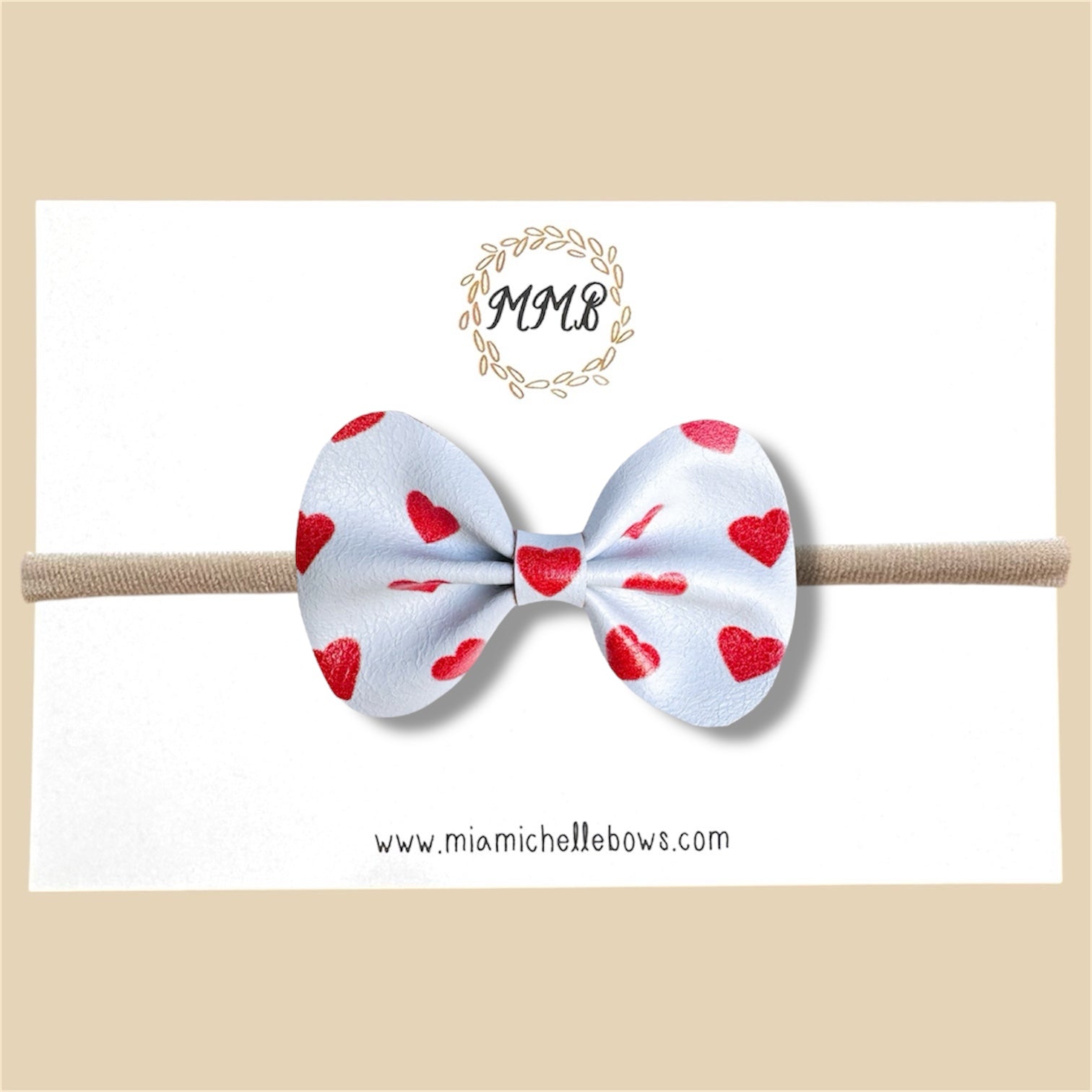 Adorable Bow made from faux leather. Measures approximately 2.75 inches across.  Available as a headband or clip!