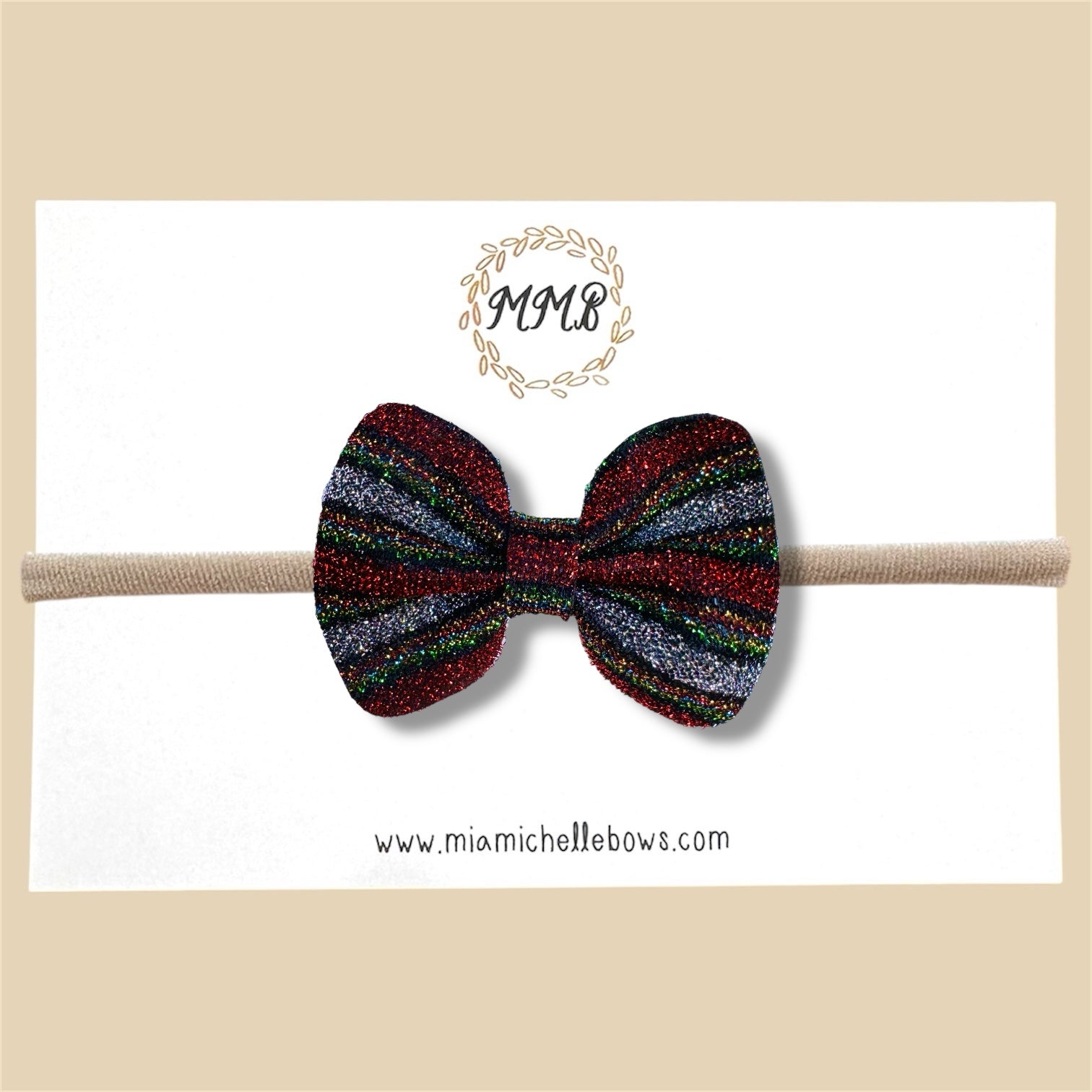 Dazzling Glitter Bow.  Made from shed resistant glitter fabric. Measures approximately 2.75 inches across.  Available as a headband or clip!