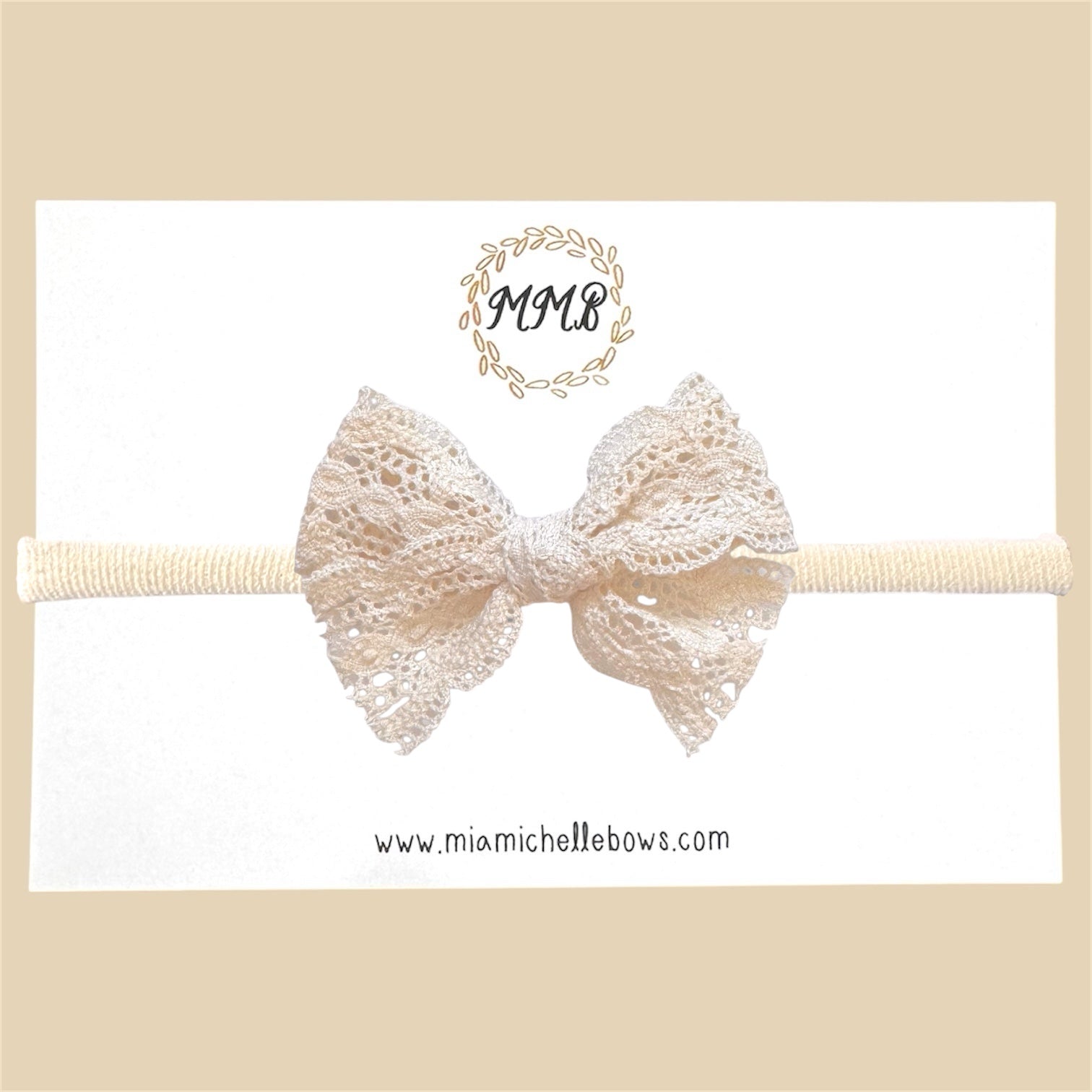 Cotton lace Bow available on super soft ivory nylon headband or alligator clip. Measures about 3 x 2.5 inches.