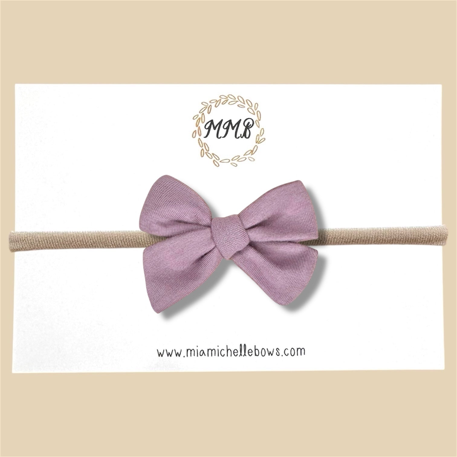 A single darling hand-tied bow made out of stretch knit fabric in your choice of size on a soft nylon headband or clip.
