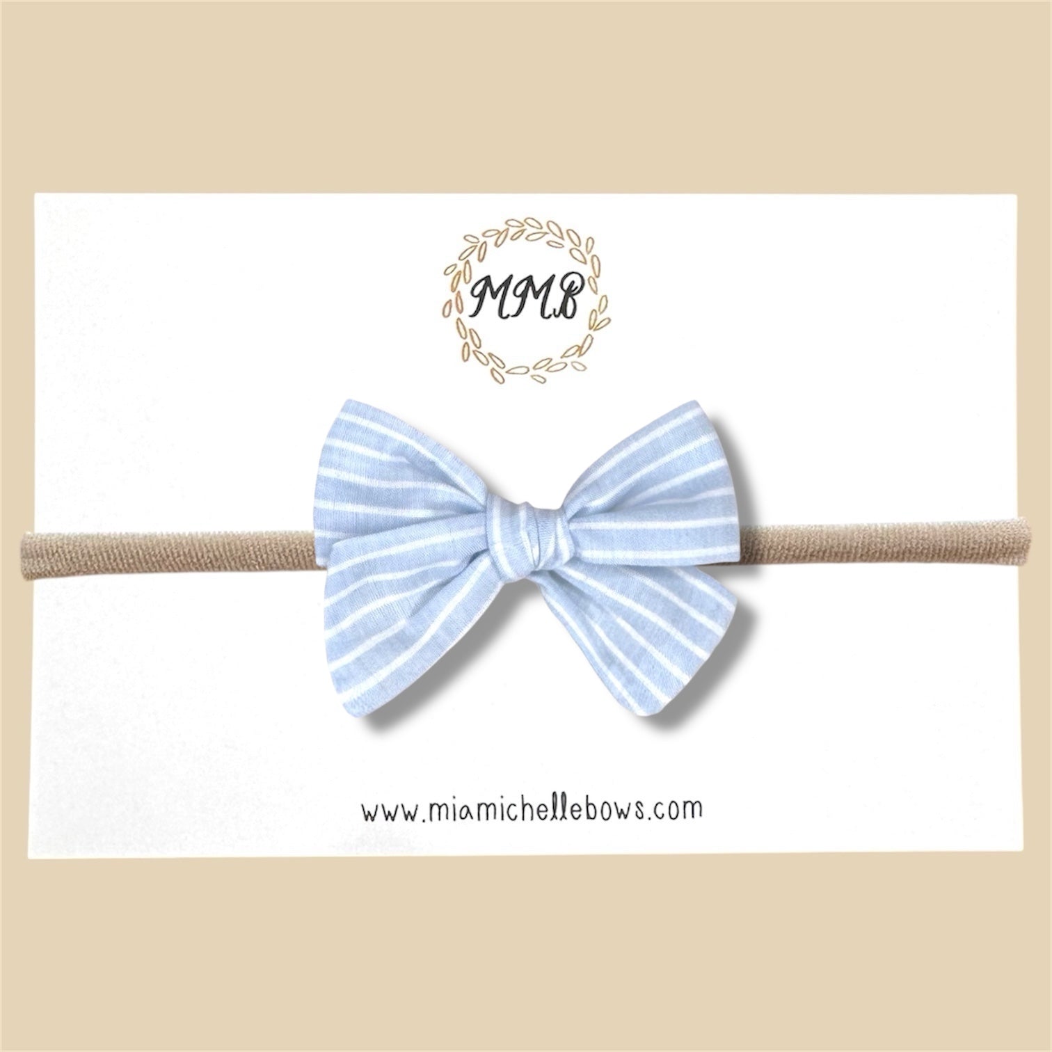 A single darling hand-tied bow in your choice of size on a soft nylon headband or clip.