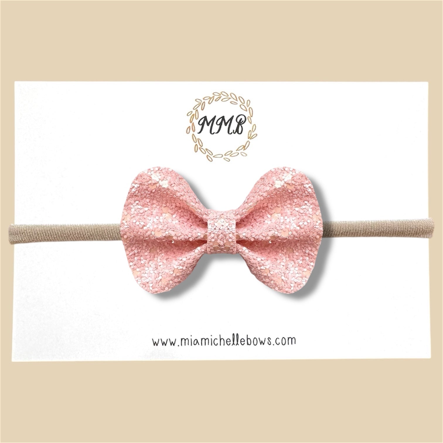 Dazzling Glitter Bow.  Made from shed resistant glitter fabric. Measures approximately 2.75 inches across.  Available as a headband or clip!