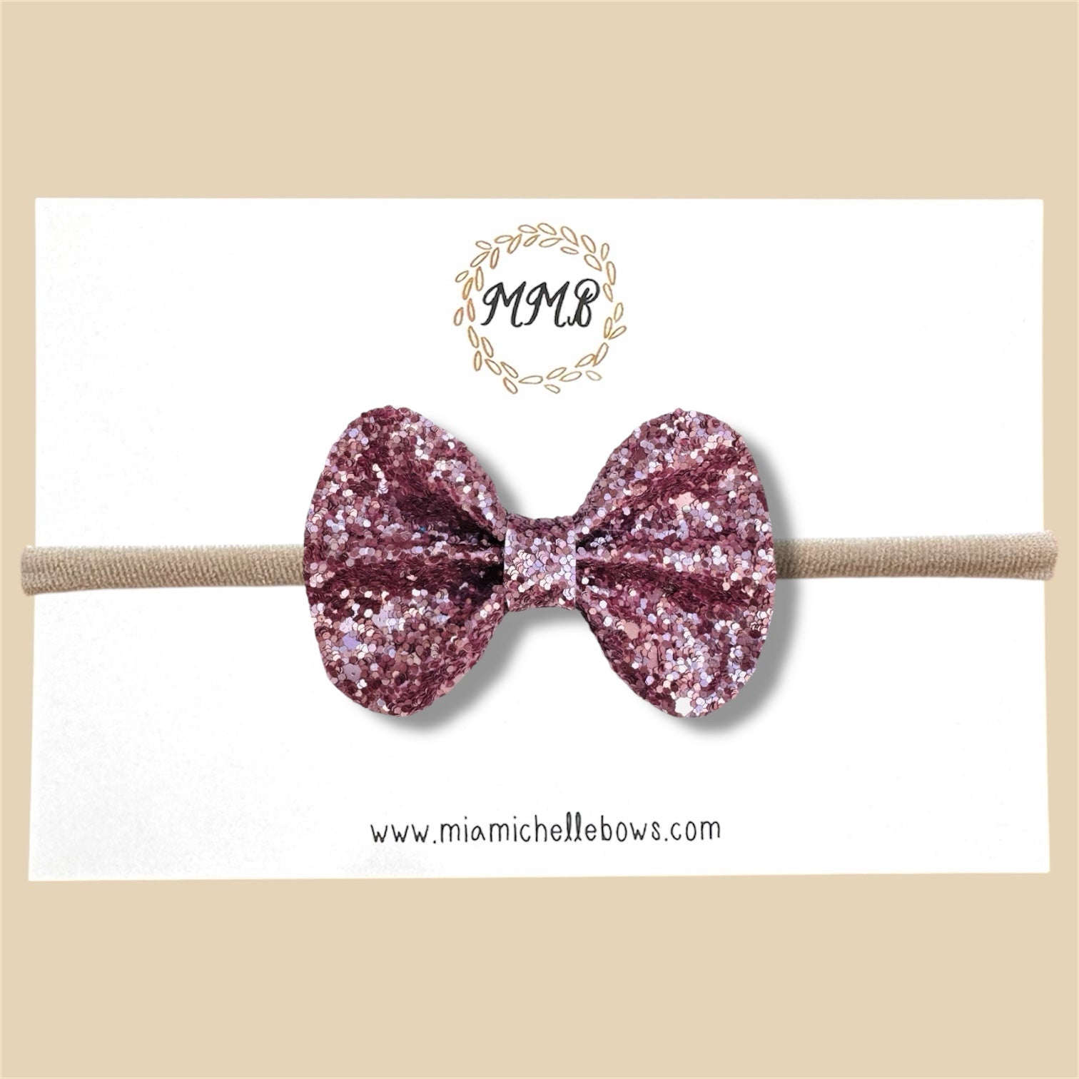 Dazzling Glitter Bow.  Made from shed resistant glitter fabric. Measures approximately 2.75 inches across.  Available as a headband or clip!