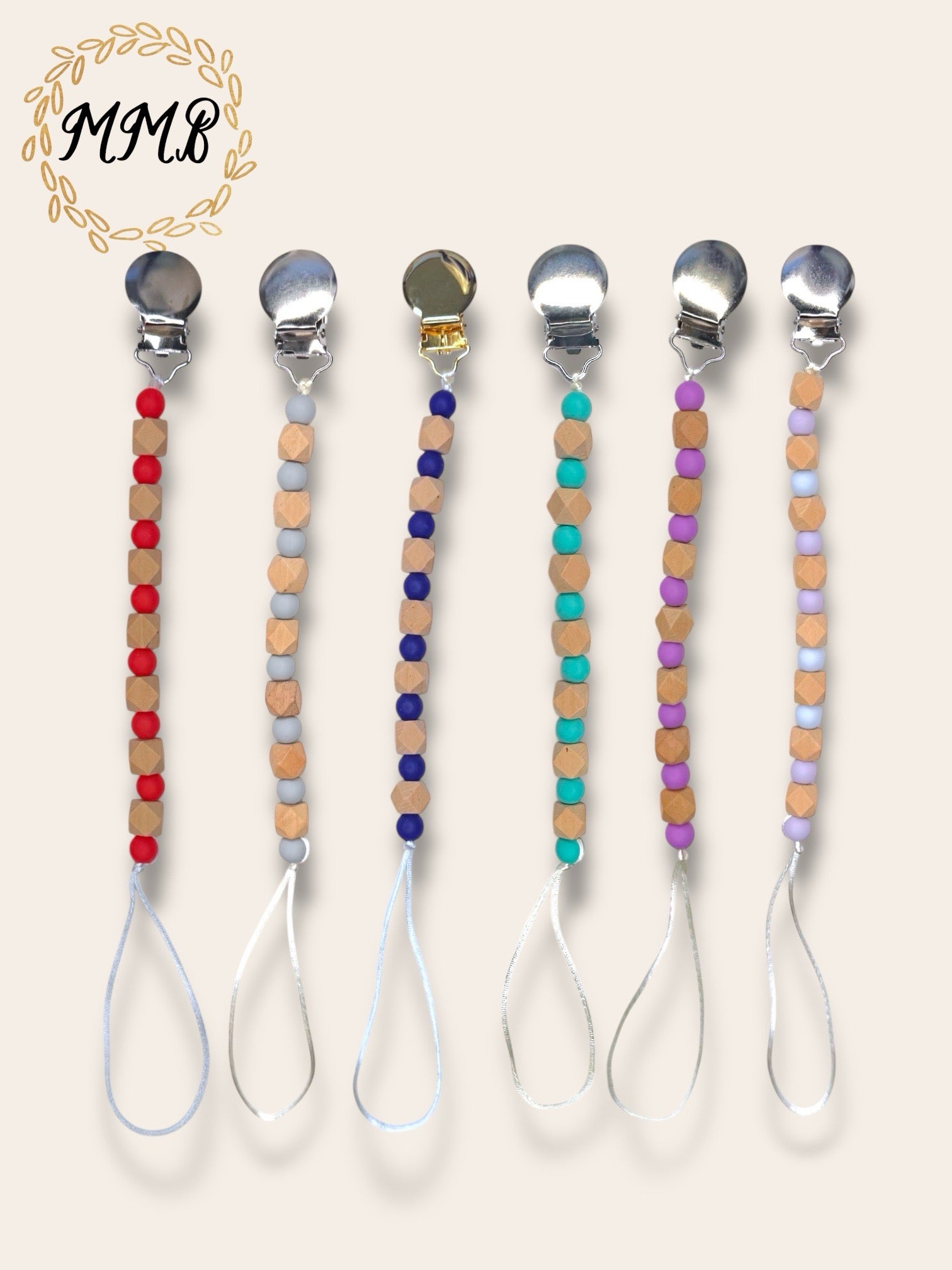 Keep pacifiers close and clean with our beautifully handmade pacifier clips—designed to be as stylish as they are practical. Each clip is thoughtfully handcrafted using a durable nylon cord, soft 8mm silicone beads, and smooth 10mm natural wooden hexagon beads for a modern, minimalist look that complements any outfit.