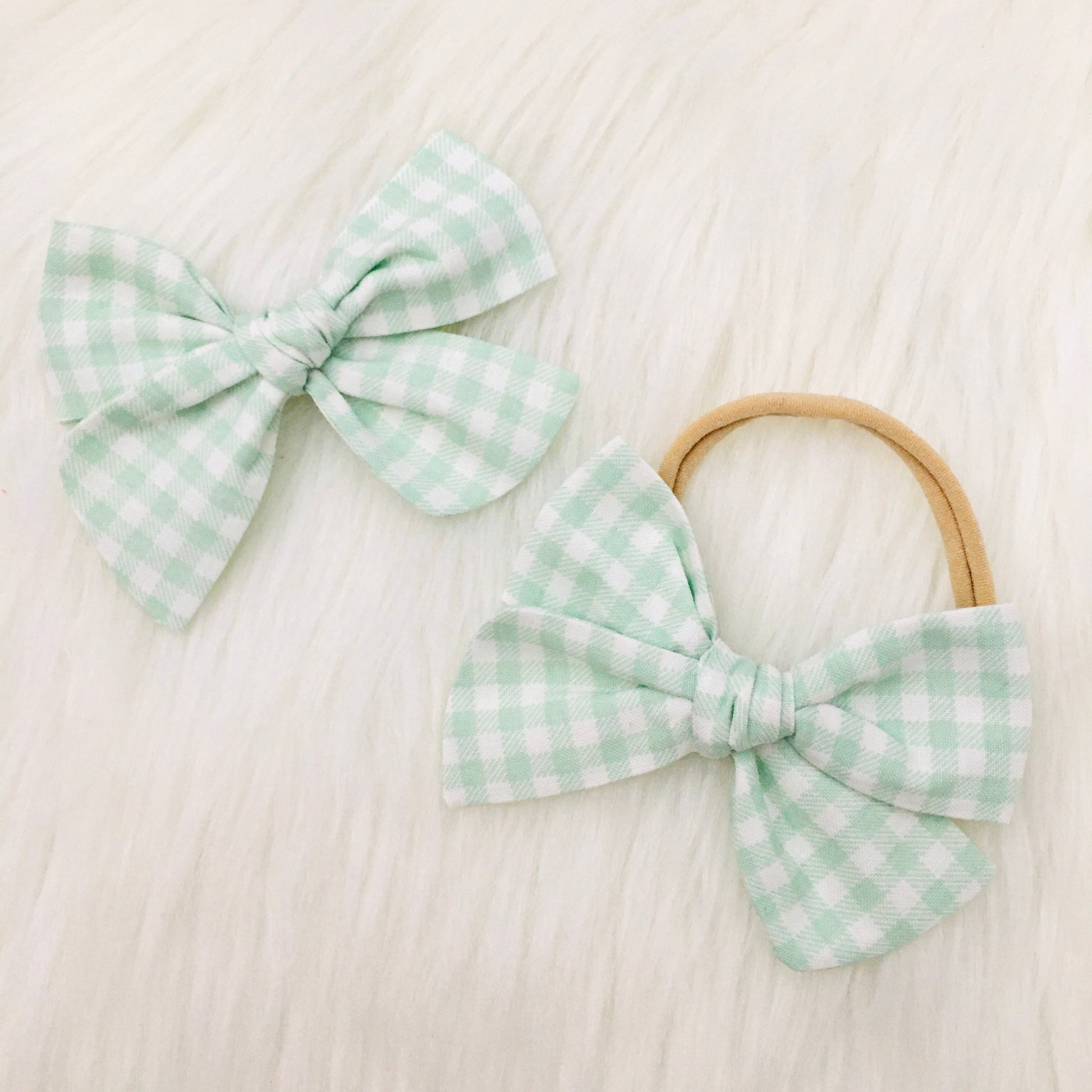 A single darling hand-tied bow in your choice of size on a soft nylon headband or clip.