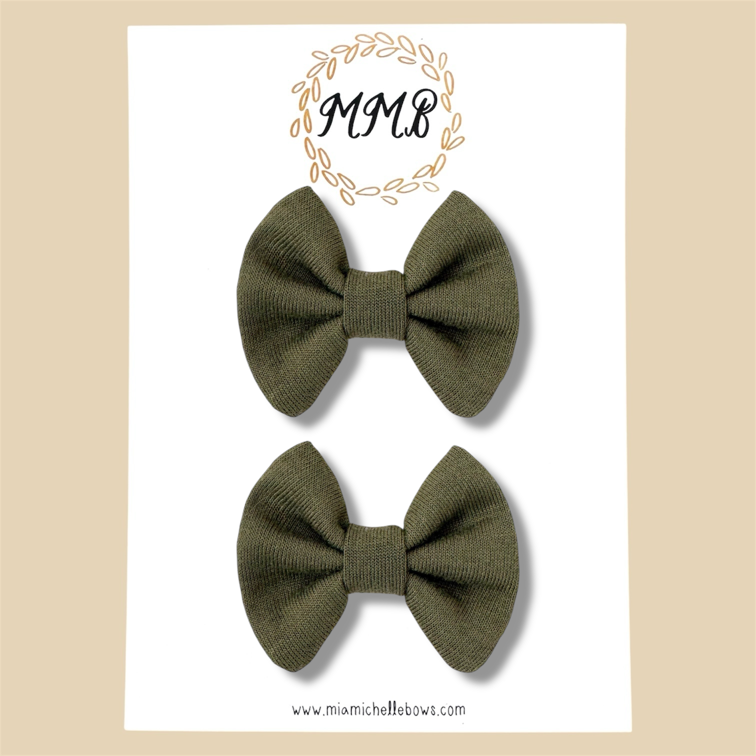 A darling set of two matching bows in a soft jersey knit fabric with alligator clips.