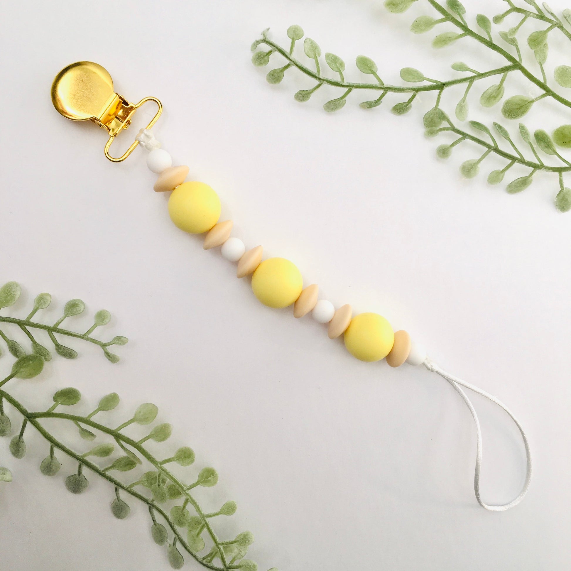 Pacifier teething clip made with food grade silicone and/or natural wooden beads. They are tied on multistrand nylon cording. Intricate knots are tied to secure and then melted to seal in place.