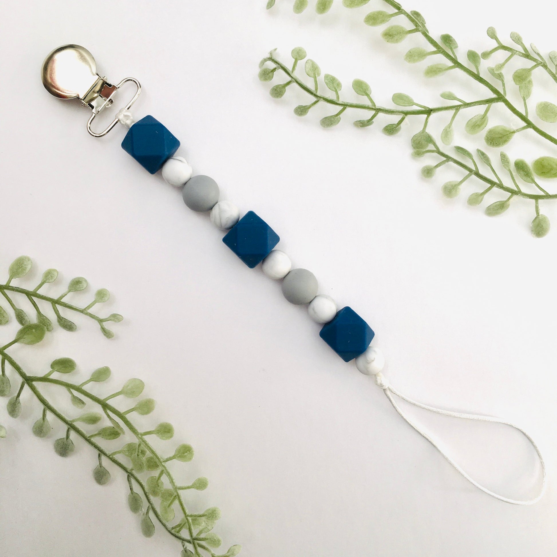Pacifier teething clip made with food grade silicone and/or natural wooden beads. They are tied on multistrand nylon cording. Intricate knots are tied to secure and then melted to seal in place.