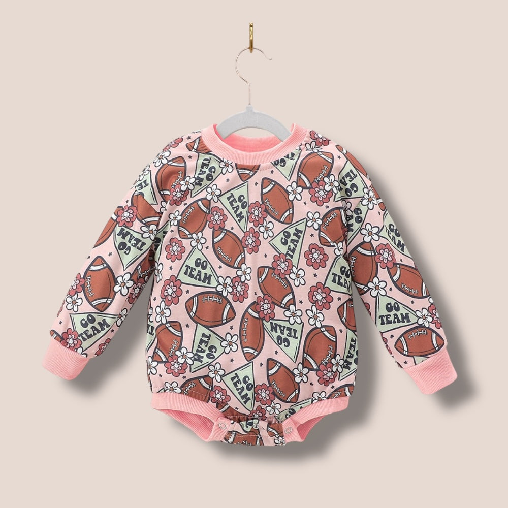 Adorable football themed oversized baby romper. With snap closure.