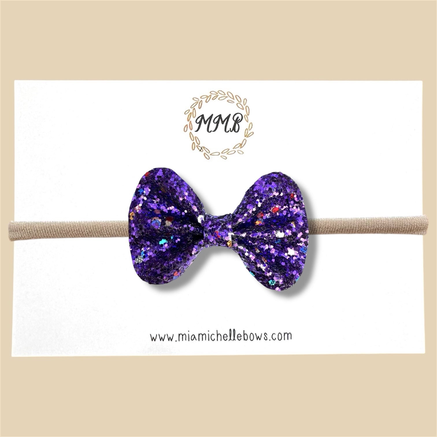 Dazzling Glitter Bow.  Made from shed resistant glitter fabric. Measures approximately 2.75 inches across.  Available as a headband or clip!