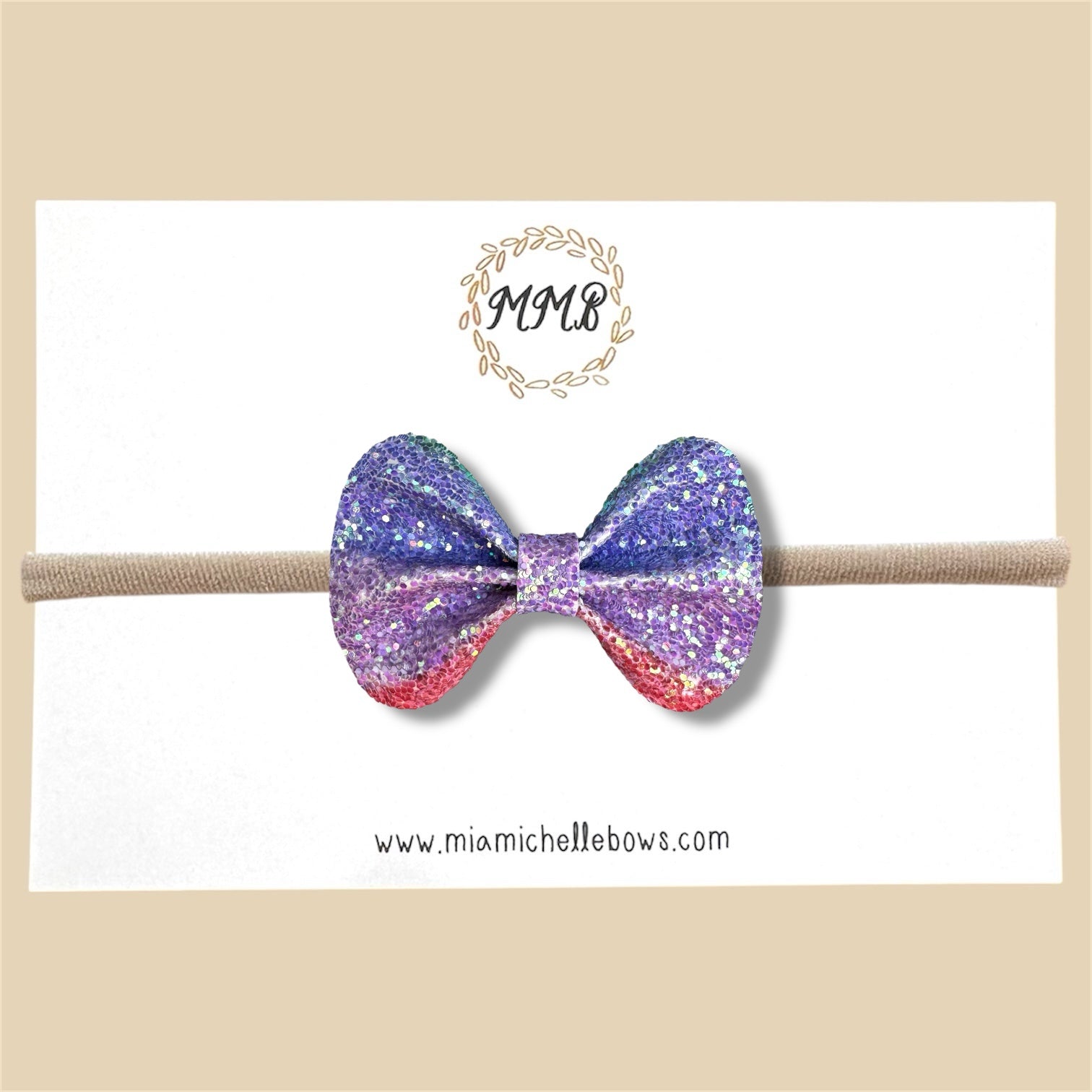 Dazzling Glitter Bow.  Made from shed resistant glitter fabric. Measures approximately 2.75 inches across.  Available as a headband or clip!