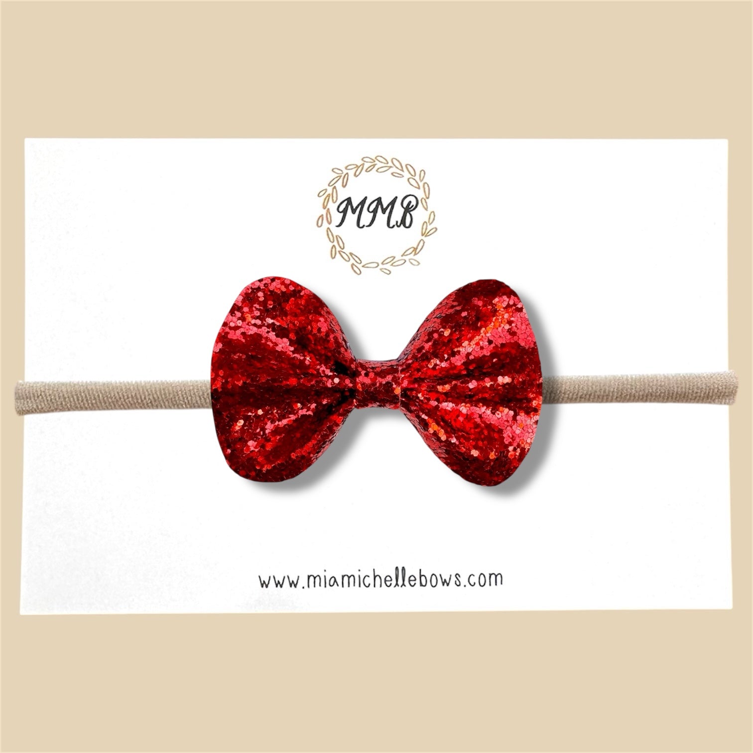 Dazzling Glitter Bow.  Made from shed resistant glitter fabric. Measures approximately 2.75 inches across.  Available as a headband or clip!