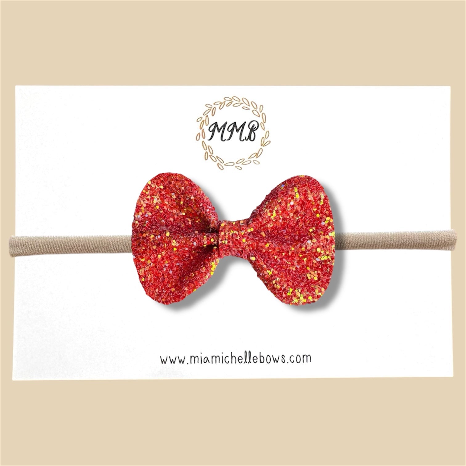 Dazzling Glitter Bow.  Made from shed resistant glitter fabric. Measures approximately 2.75 inches across.  Available as a headband or clip!