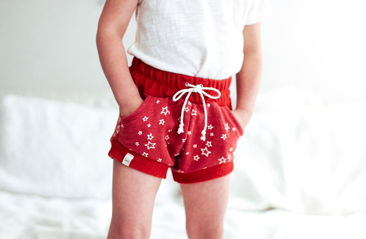 Adorable red jogger shorties..bummies. Elastic waistband and functional pockets. perfect for boys or girls. With non functional drawstring detail. Available in newborn up to 3T