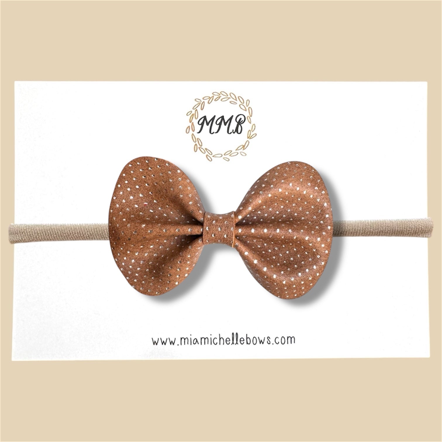 Adorable Bow made from faux leather. Measures approximately 2.75 inches across.  Available as a headband or clip!