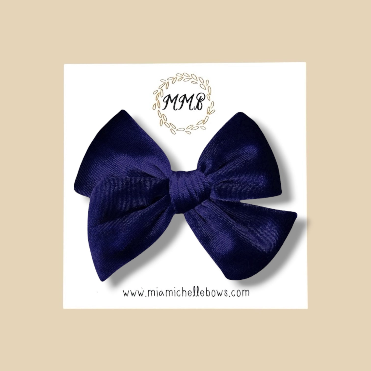 A single velvet handmade bow offered in 2 sizes and available as a headband or a clip.
