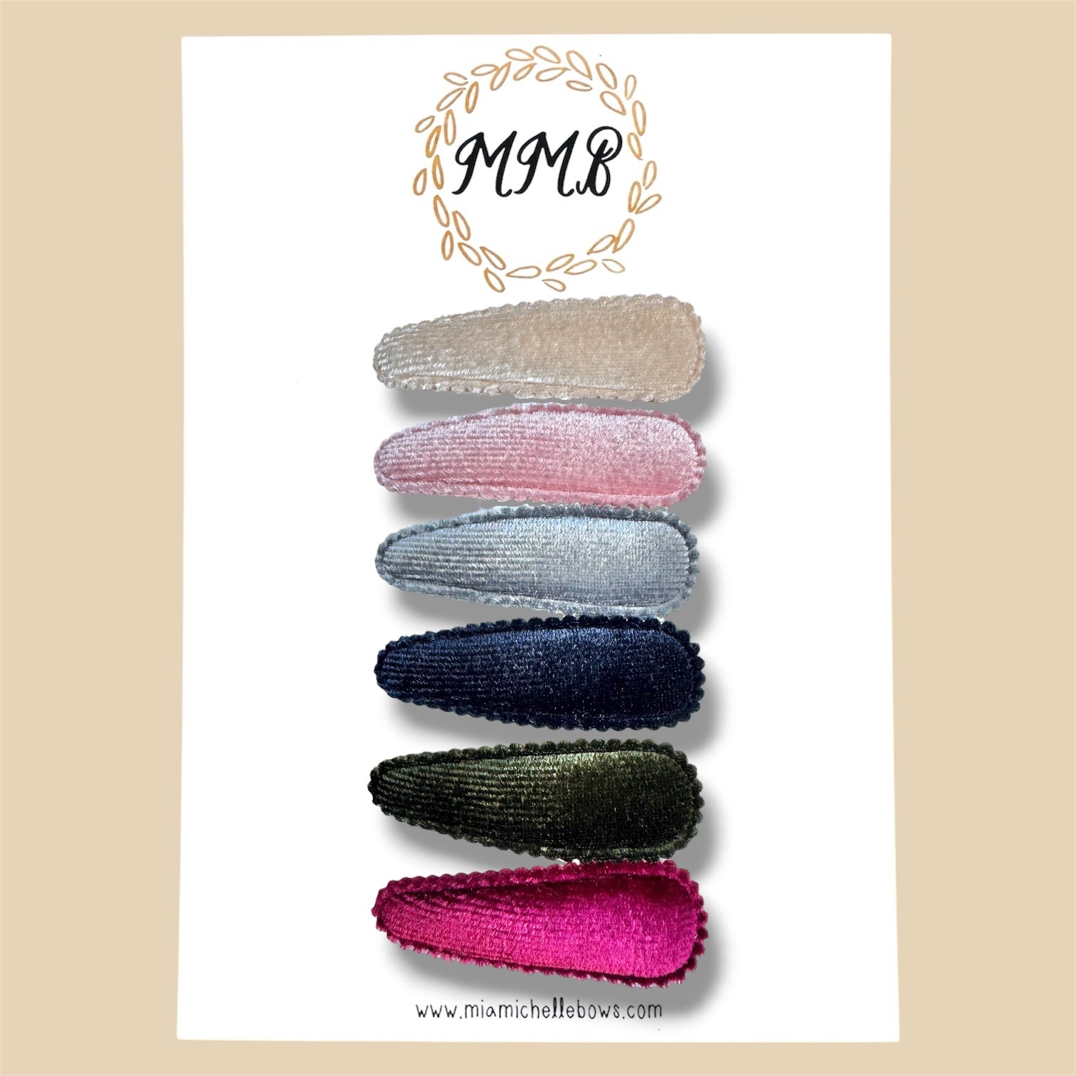 Cute set of 6 snap clips in ivory, blush, gray, navy, Hunter green, and burgundy. They each measure 2 & 1/4 inches across.
