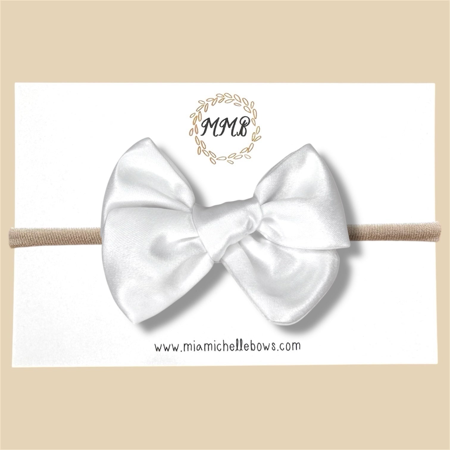 A single darling hand-tied bow in your choice of size on a soft nylon headband or clip.