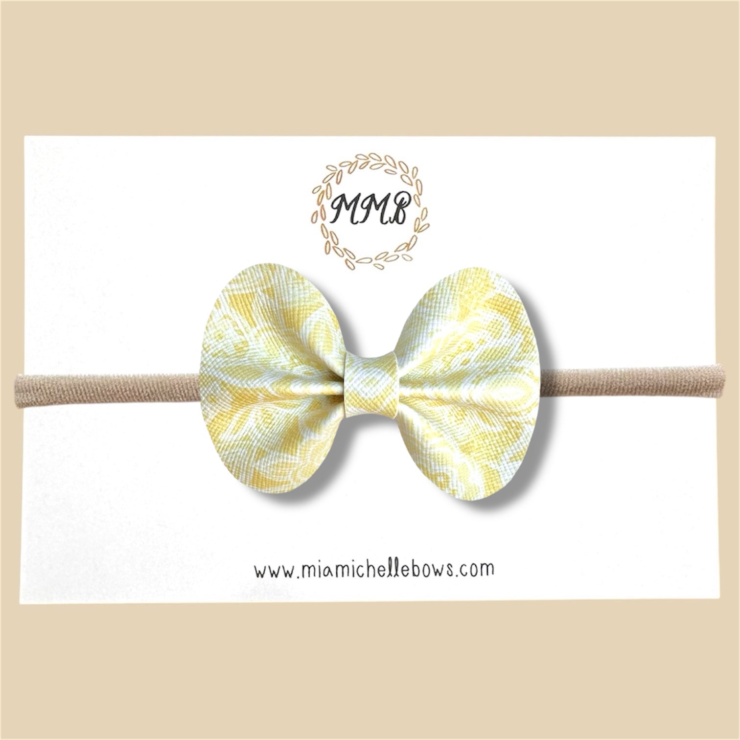 Adorable Bow made from faux leather. Measures approximately 2.75 inches across.  Available as a headband or clip!
